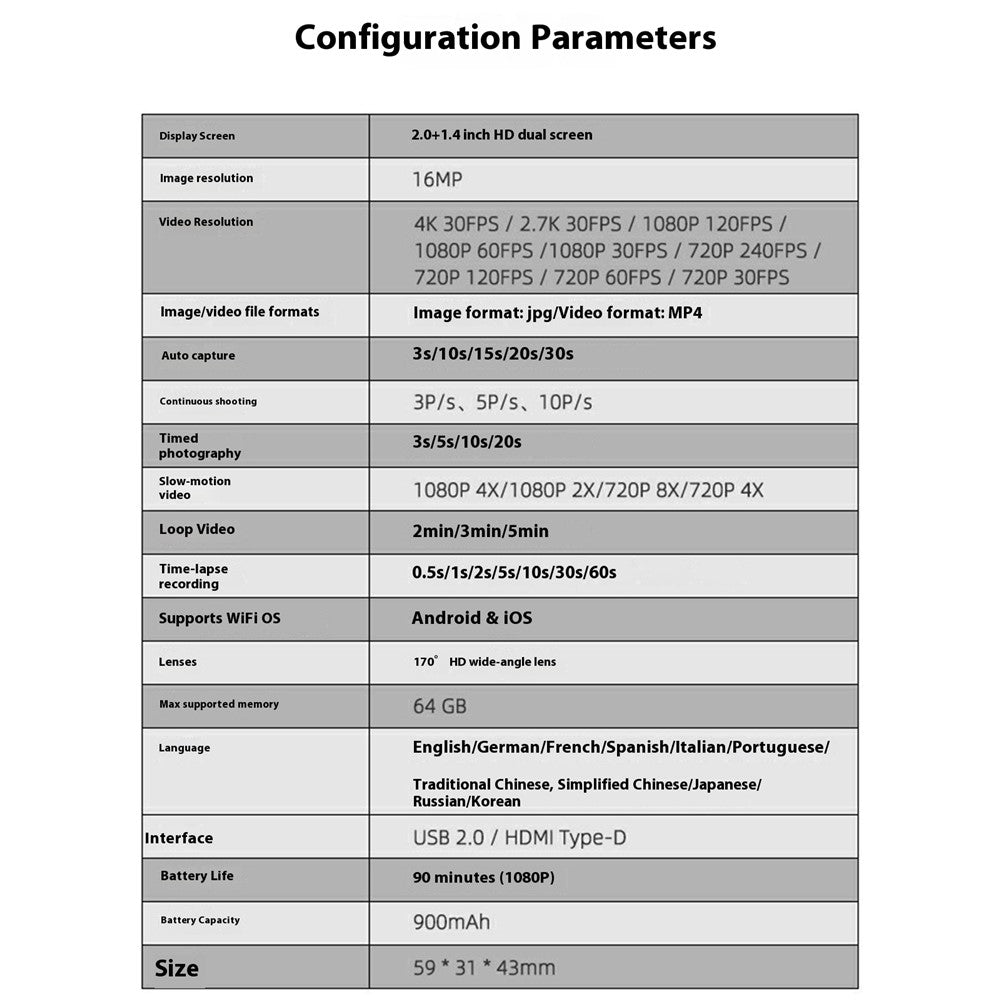 - Video Resolution: 4K 30FPS, 2.7K 30FPS, 1080P 120/60/30FPS, 720P 240/120/60/30FPS